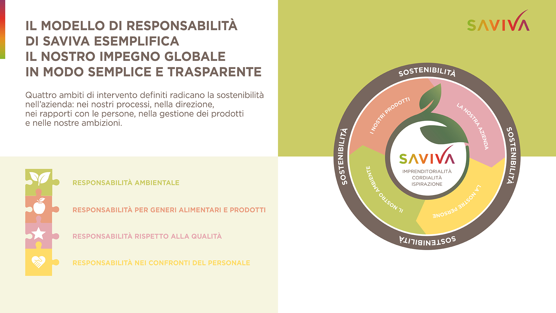 Ci assumiamo la nostra responsabilità ambientale, sociale ed economica lungo l'intera catena del valore aggiunto e ci poniamo obiettivi ambiziosi. Per Saviva, sostenibilità significa essere consapevoli dell'effetto delle proprie azioni e cercare di migliorare continuamente.