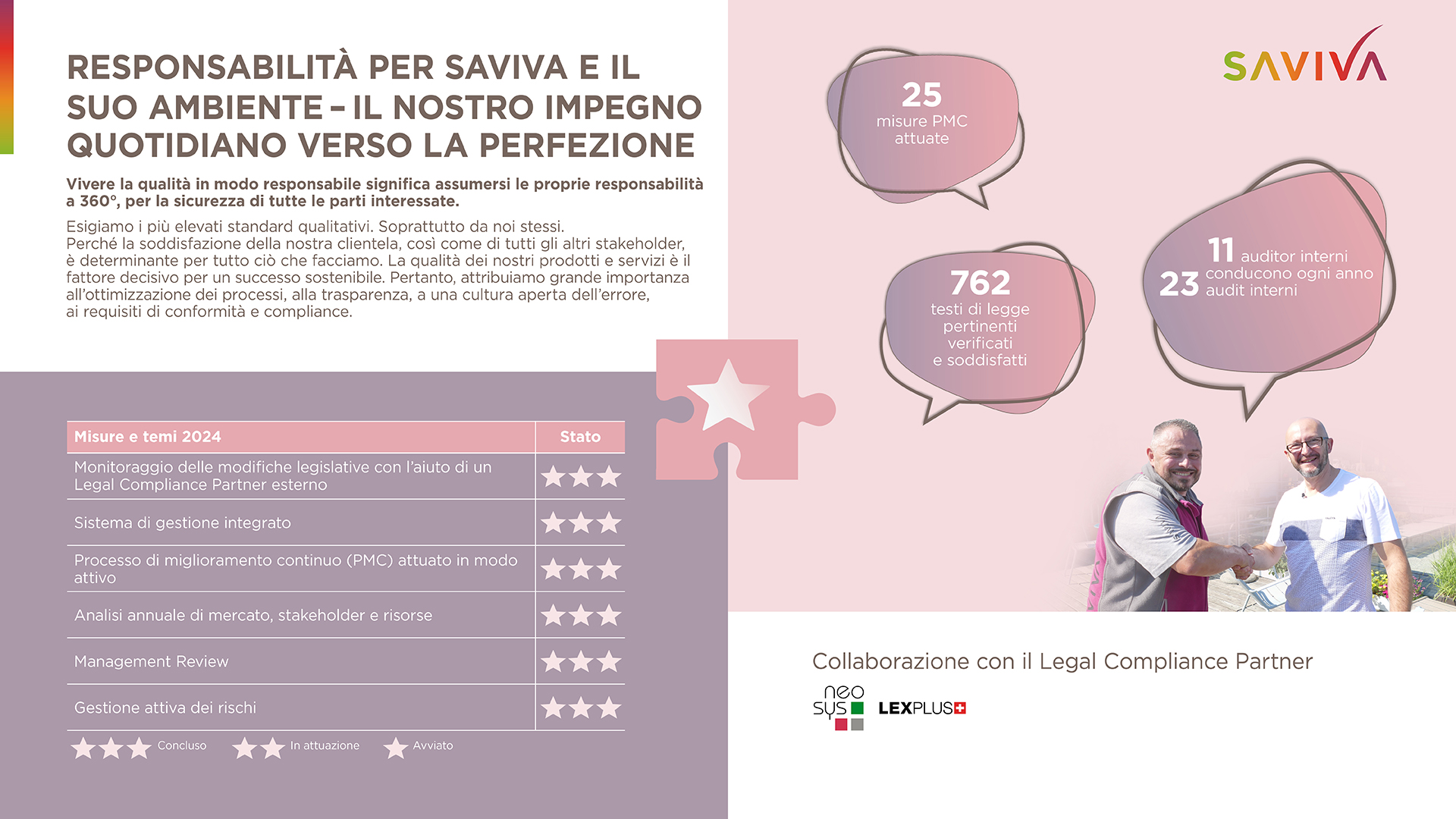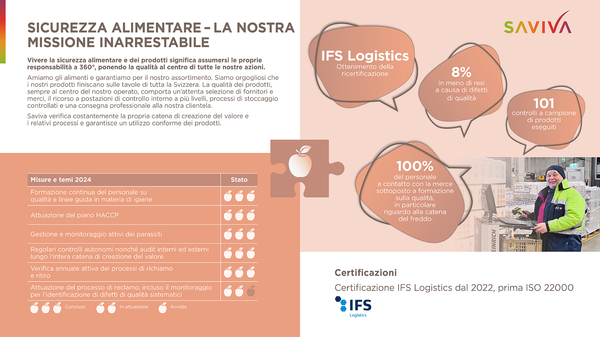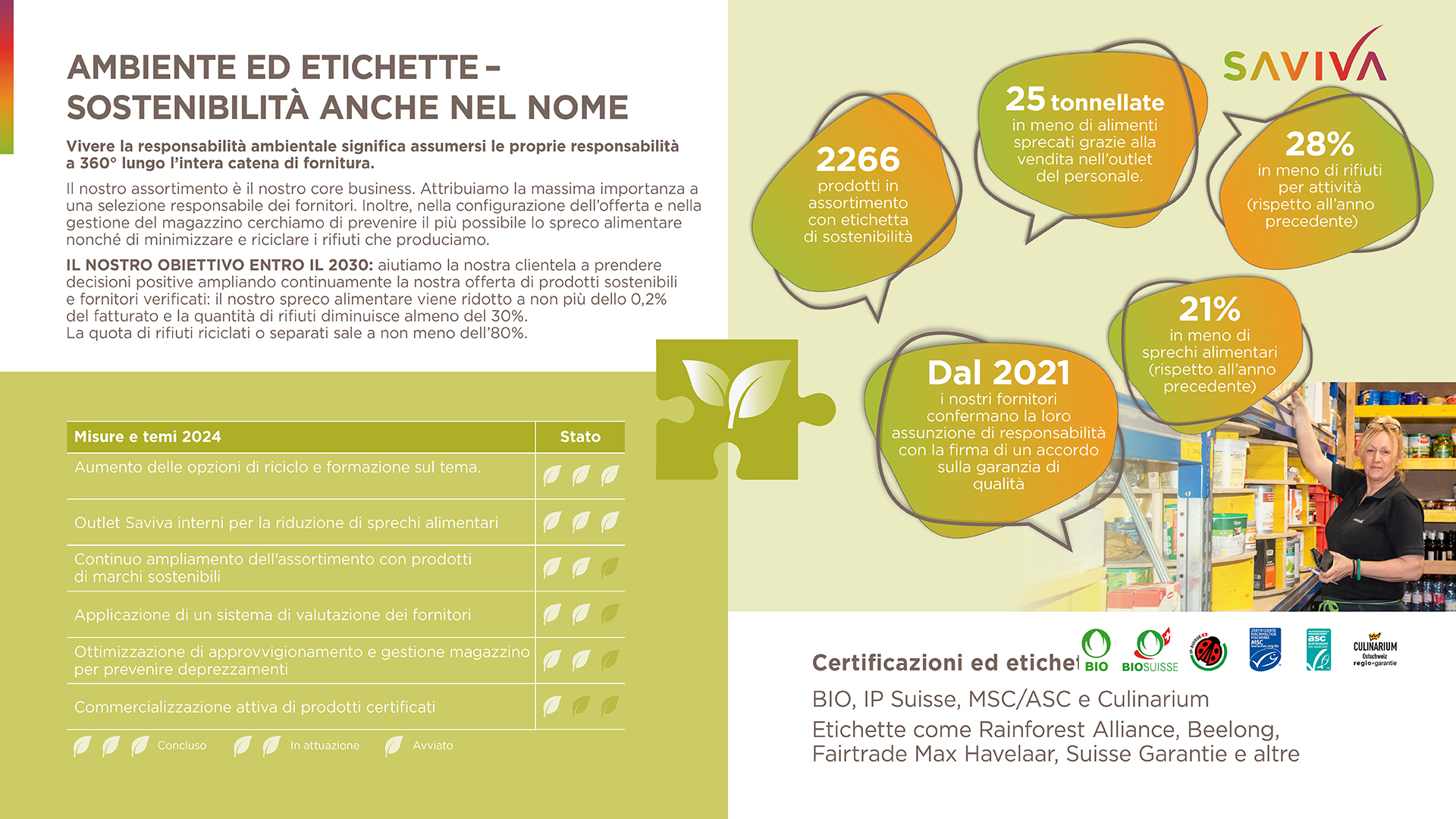Per noi di Saviva, condividere i nostri sforzi e i nostri progressi in modo trasparente con il nostro ambiente è una questione di cuore. Nel rapporto di sostenibilità 2024 presentiamo gli obiettivi e i successi più importanti nei quattro campi di azione.